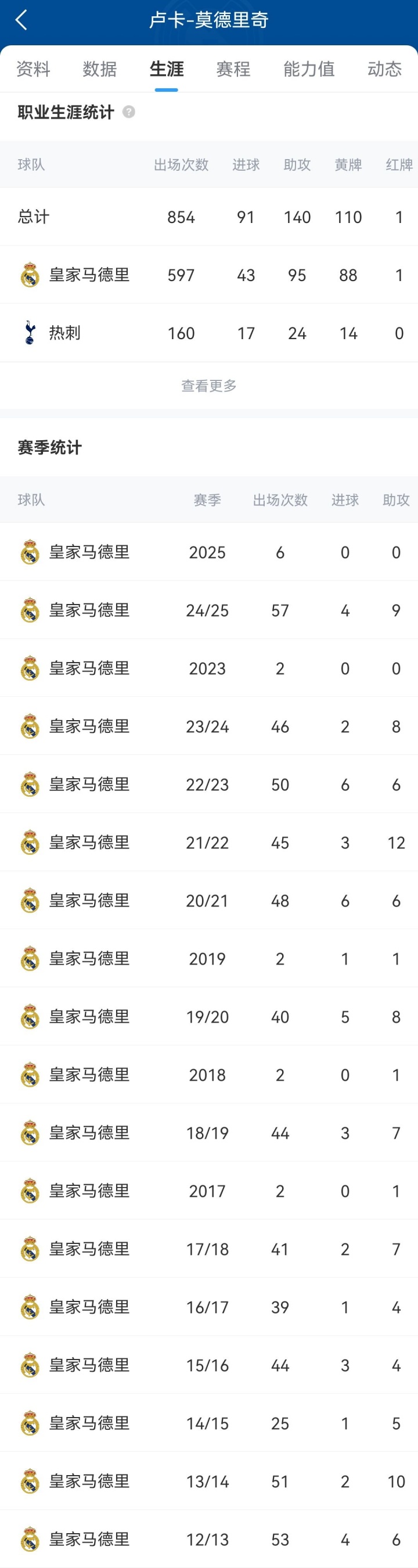 莫德里克(Modric)于2012年加入了皇家馬德里(Real Madrid)。他在13年內(nèi)進(jìn)行了597場(chǎng)比賽,打進(jìn)43球并協(xié)助95次比賽,幫助球隊(duì)贏得28冠軍獎(jiǎng)杯:6個(gè)冠軍聯(lián)賽,6個(gè)俱樂部世界杯,5個(gè)歐洲超級(jí)杯,4個(gè)La Liga,2杯杯,2杯德爾·埃爾·雷伊和5個(gè)西班牙超級(jí)杯。