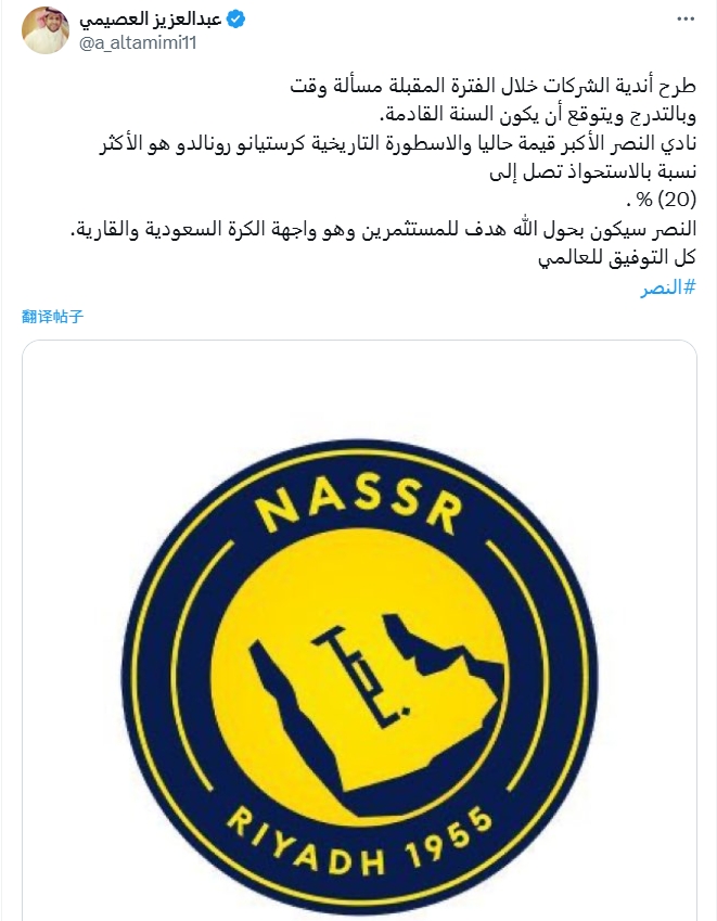沙特記者:羅納爾多目前擁有利雅得勝利的權益比例最高 達到20